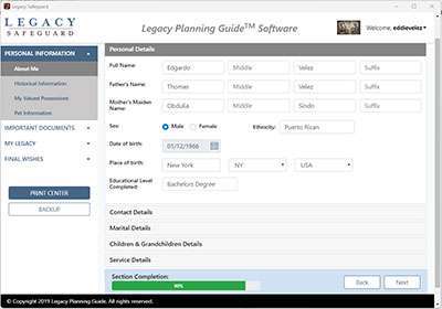 - A proprietary software program (for either Windows or Mac), where you will input and safeguard (no pun intended) your vital and private data, historical information, your valued possessions, pet information, (if applicable) veteran’s service information for VA benefits, financial information, important legal documents, online account information for your digital footprint (Facebook, LinkedIn, Instagram, etc.), final wishes to include funeral arrangements and even the music you would prefer for your celebration of life…AND MORE.
